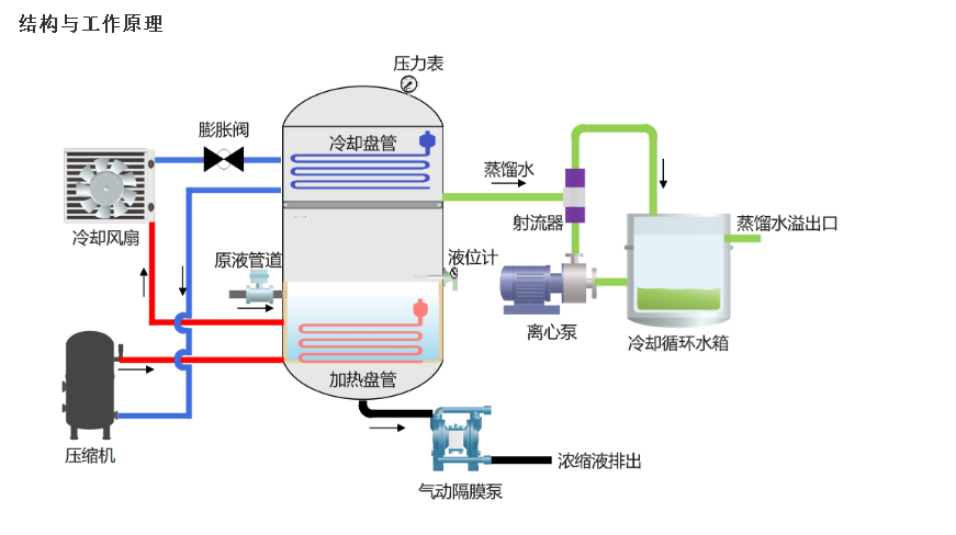 主要通过内部负压系统、蒸馏釜、交换系统及设备自身热能系统的转换,对高危废水原液进行热交换,使原液在25~35℃时汽化,然后回收再利用